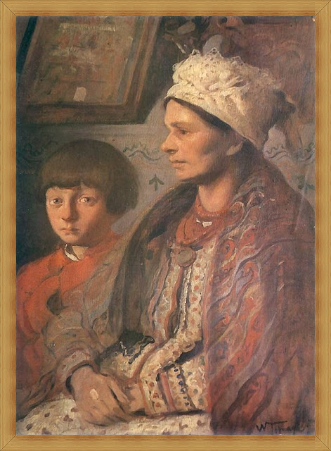 Pisałam już o tym w galerii obrazów z motywem dziecka, że z pracowni Włodzimierza Tetmajera w Bronowicach korzystało kilku artystów, zwłaszcza Ci, którzy ulegli tak zwanej chłopomanii. Należał do nich między innymi Wincenty Wodzinowski.